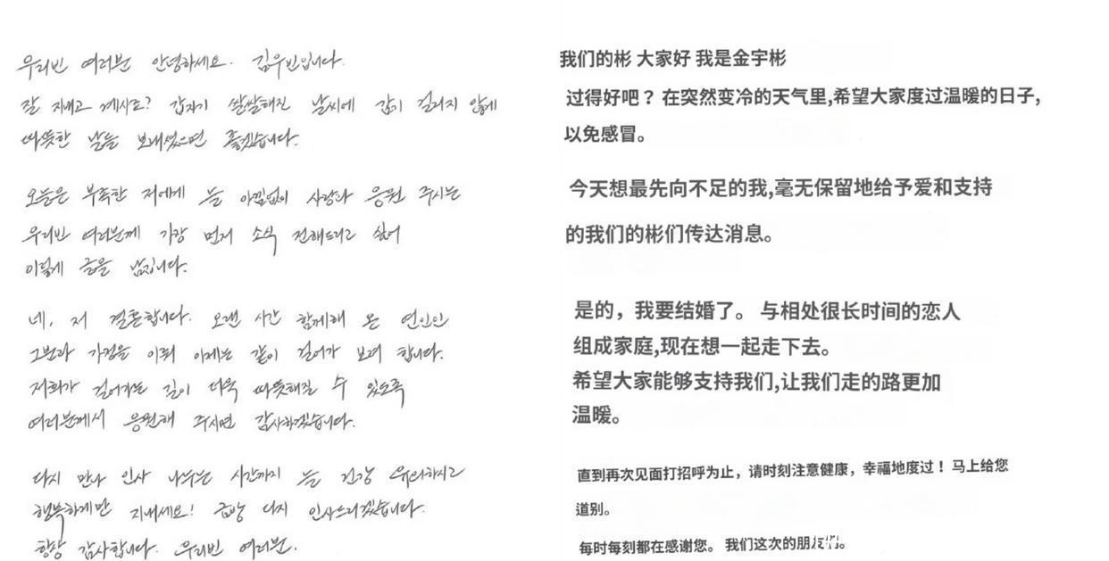 金宇彬的亲笔信写得真诚又动人,字里行间全是对申敏儿的爱,这对被称为韩娱最治愈CP的恋人,用时间证明了:真爱能抵万难。
